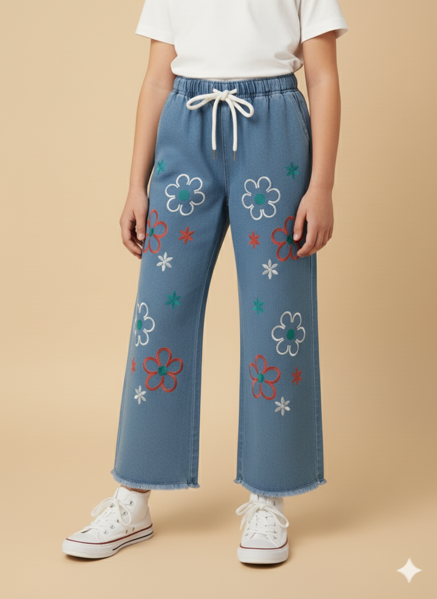 Girls’ Colorful Floral Embroidered Denim Jeans – Light Blue KFJ-T002